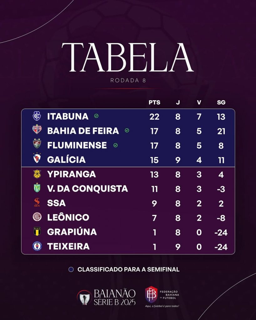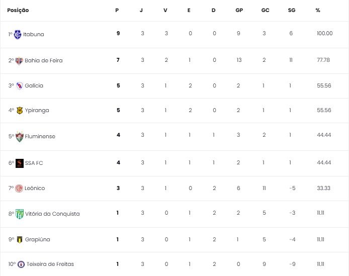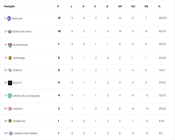 Na sequência da tabela, Fluminense de Feira e SSA FC têm quatro pontos, com vantagem do time feirense nos critérios de desempate. O Leônico, com três pontos, ocupa a sétima posição.
