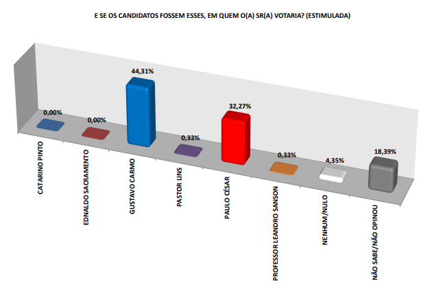 No cenário estimulado, Carmo, que conta com o apoio do atual prefeito Joaquim Neto (PSD), mantém a liderança com uma pequena queda nos votos, chegando 44,31%. Paulo Cezar se manteve com o mesmo percentual do panorama espontâneo, com 32,27%. Os indecisos se mantiveram em 18,39%.
