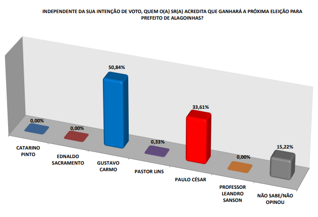 Quando questionados sobre quem eles acreditam que ganhará a eleição, independente de suas opções de voto, 50,84% dos eleitores afirmaram que Carmo venceria o pleito, enquanto 33,61% escolheram Paulo Cezar. 15,22% não sabiam ou preferiram não responder.