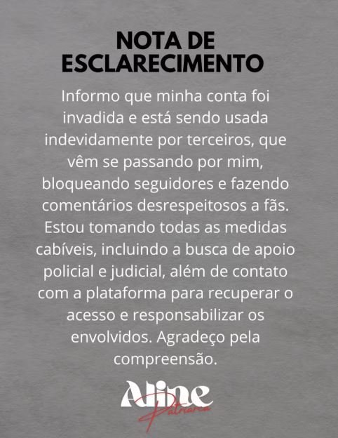 "Informo que minha conta foi invadida e está sendo usada indevidamente por terceiros, que vêm se passando por mim, bloqueando seguidores e fazendo comentários desrespeitosos a fãs. Estou tomando todas as medidas cabíveis, incluindo a busca de apoio policial e judicial, além de contato com a plataforma para recuperar o acesso e responsabilizar os envolvidos. Agradeço pela compreensão."