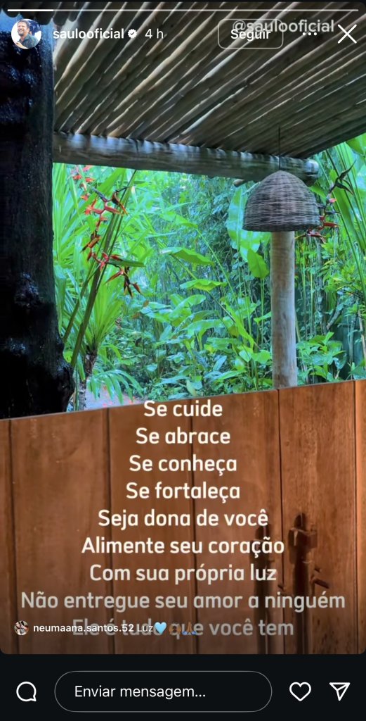 No Instagram, a mensagem do dia compartilhada pelo intérprete de 'Vú', fala sobre se cuidar, se amar e se fortalecer. O conselho dado por Saulo foi lido como uma resposta para a ex-Cheiro de Amor.