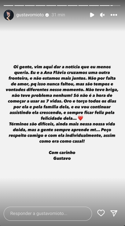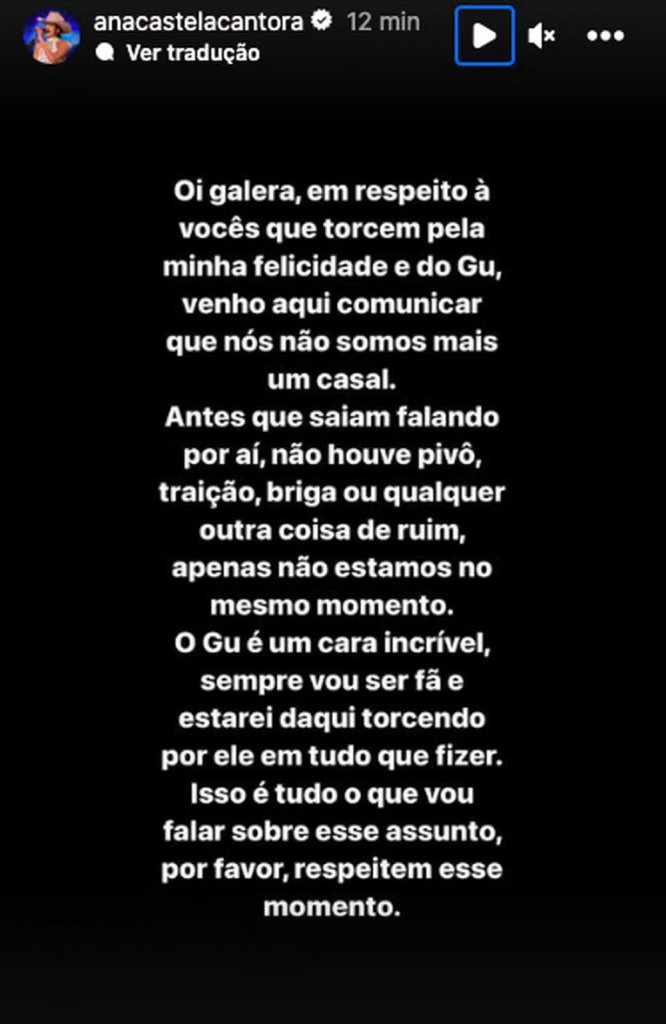 "Oi galera, em respeito à vocês que torcem pela minha felicidade e do Gu, venho aqui comunicar que nós não somos mais um casal. Antes que saiam falando por aí, não houve pivô, traição, briga ou qualquer outra coisa de ruim, apenas não estamos no mesmo momento", disse.
