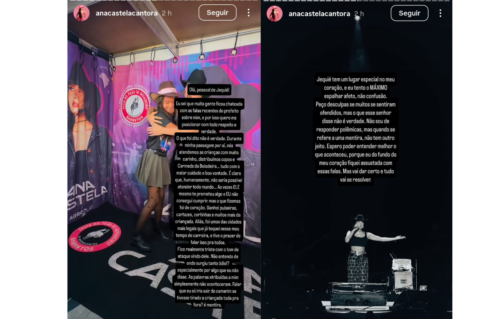 A cantora Ana Castela se pronunciou em suas redes sociais após o prefeito de Jequié, Zé Cocá, repudir a postura da artista durante seu show nos festejos juninos da cidade. Segundo o gestor, a sertaneja teria se recusado a fazer fotos com fãs mirins.