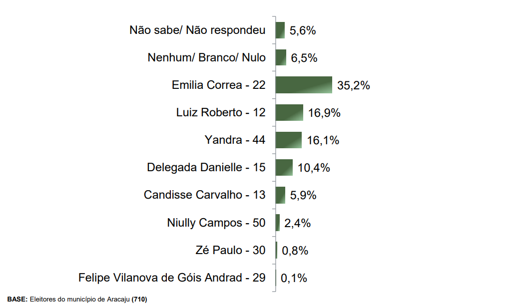 Um levantamento feito pelo Instituto Paraná Pesquisas e divulgado nesta segunda-feira (16) mostra que a vereadora Emília Corrêa (PL) lidera com 35,2% das intenções de voto na corrida pela prefeitura de Aracaju (SE).