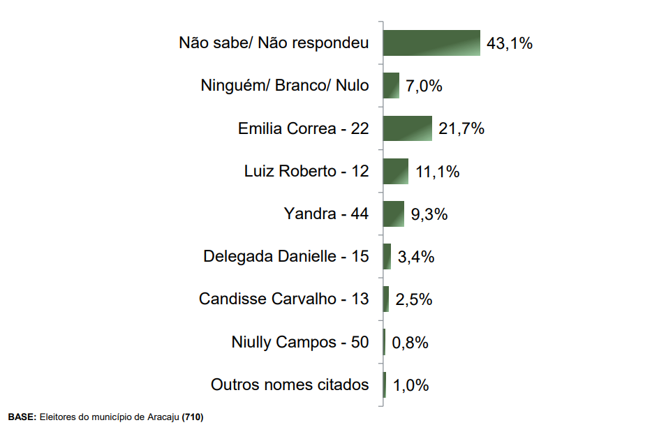 A pesquisa também testou a preferência do eleitorado de Aracaju em um eventual segundo turno entre Emilia Correa e Delegada Danielle. Neste caso, a vereadora do PL lidera com 54,2% frente a 27,6% da emedebista.
