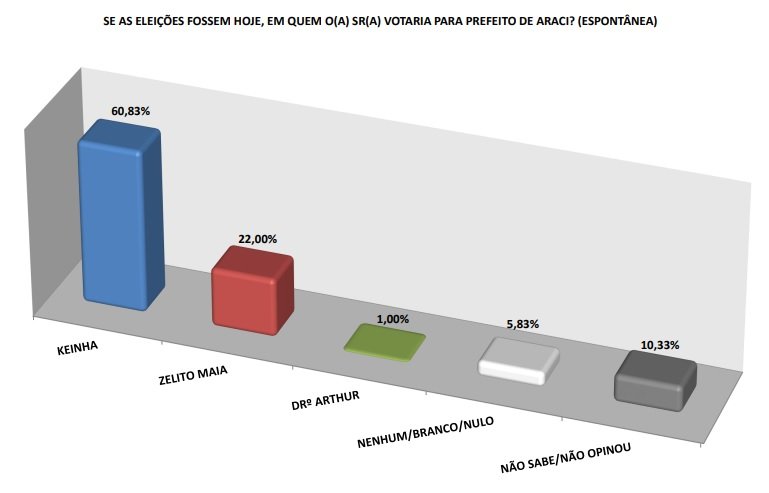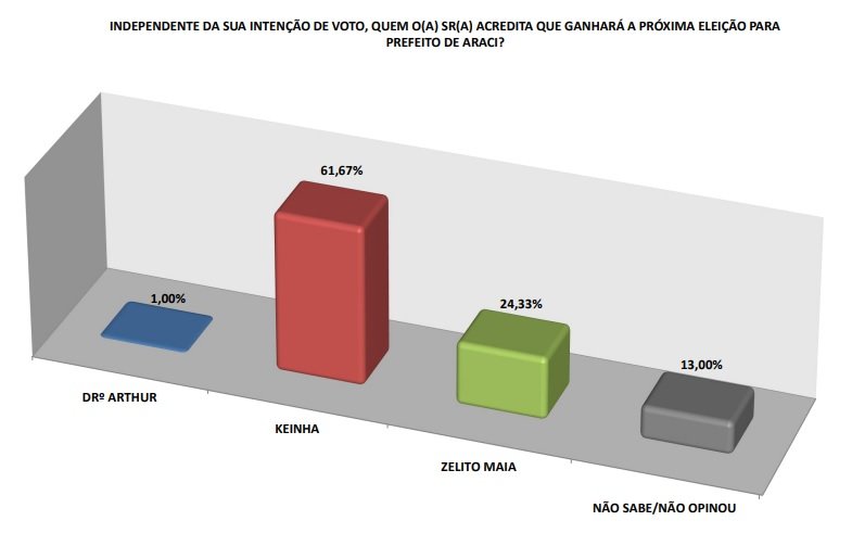 A pesquisa também quis saber quem o eleitor acredita que vencerá o pleito, independente da intenção dele. Neste ponto, Keinha teve 61,67%, Zelito Maia 24,33% e Arthur Barbosa dos Santos, 1%. Não sabe ou não opinou foram 13%.