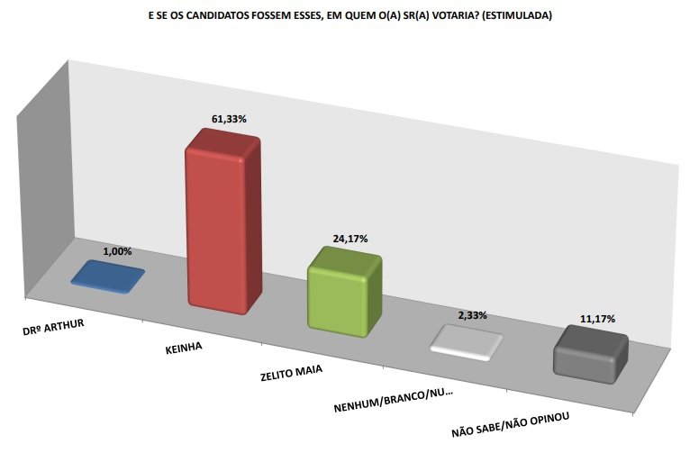 Na estimulada, quando os nomes são citados, Keinha obteve 61,33%%, Maia teve 24,17% e Arthur ficou em 1%. Nenhum, branco ou nulo chegou a 2,33%. Não sabe ou não opinou, 11,17%. No quesito rejeição, o empresário encabeça a lista. Zelito Maia registrou 31%, Arthur teve 29,33% e Keinha 14,83%. Nenhum, branco ou nulo foram 5,33%. Não sabe ou não opinou, 19,50%.