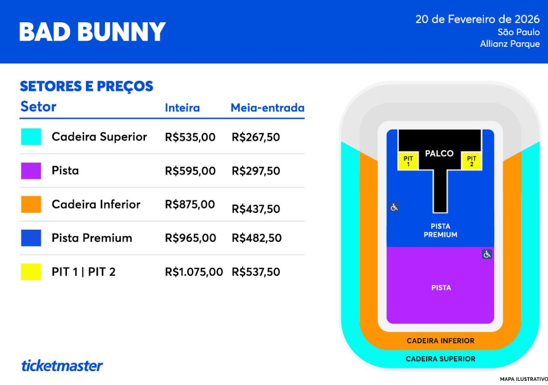 Vencedor de três prêmios do Grammy, o cantor se apresentará no Brasil dias após a apresentação no Levi’s Stadium em Santa Clara, Califórnia. O show de Bad Bunny ocorrerá em São Paulo, no dia 20 de fevereiro de 2026.