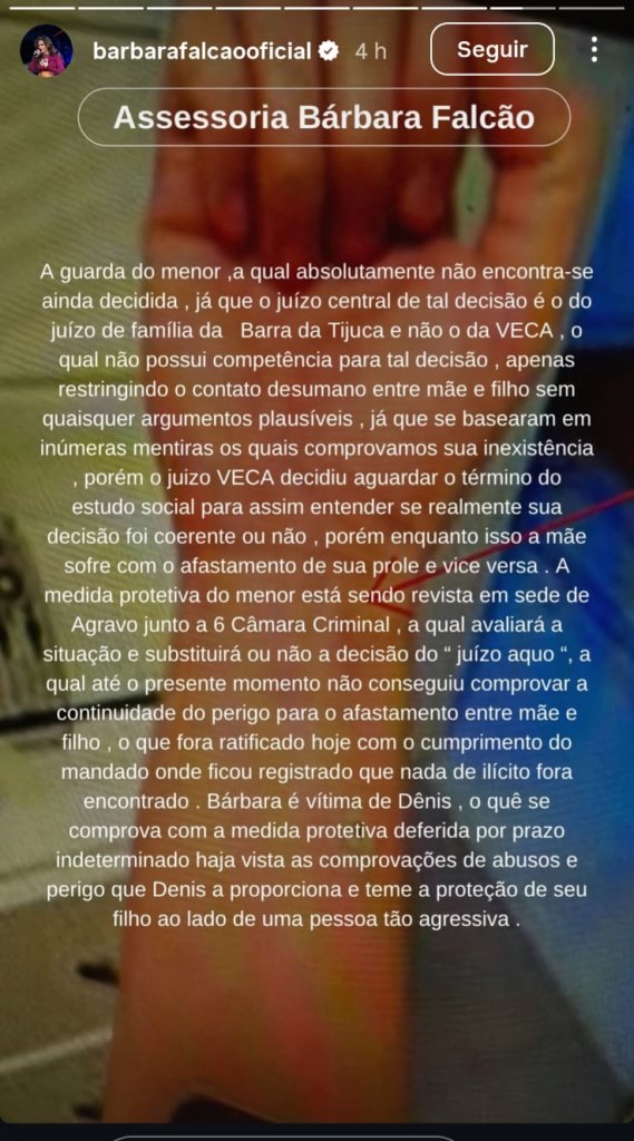 No desabafo, Bárbara afirmou que ela e seu filho são vítimas. “Uma criança não é uma moeda de troca, não é um fantoche. Merece respeito, cuidado, acolhimento, uma mãe. Meu filho tem uma mãe que vai lutar por ele até o fim”, disse.