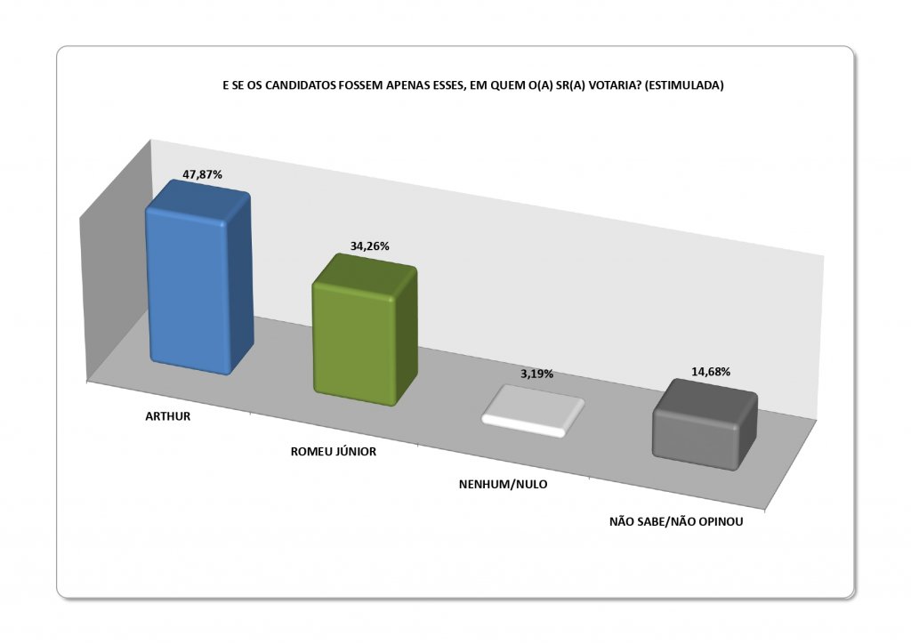 Pensando na possibilidade da disputa entre os candidatos com as maiores pontuações - numa eventual desistência de Paulinho do Destak, Artur Filho tem 47,87% dos votos, enquanto o candidato da oposição, Romeu Júnior (PT), aparece com 34,26%. Os eleitores que não sabem/não opinaram somam 14,68% os que votariam nulos 3,19%.