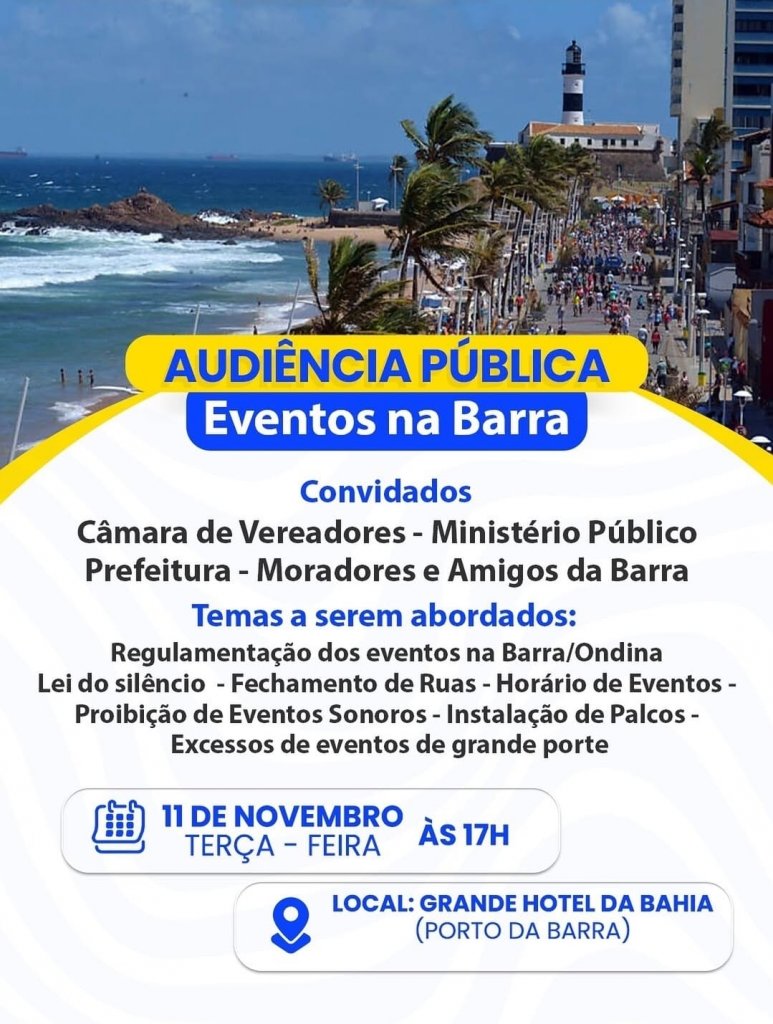 Uma audiência pública será realizada no próximo dia 11, às 17h, no Grande Hotel da Bahia, localizado no Porto da Barra, em Salvador, para discutir a regulamentação de eventos na região da Barra/Ondina.