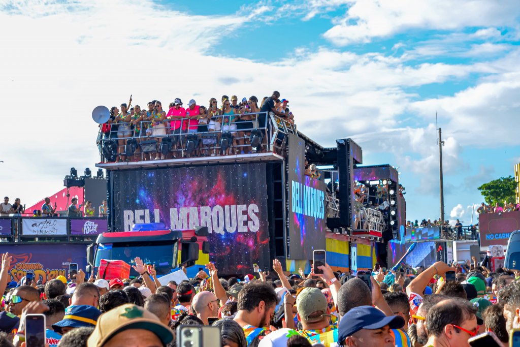 Uma hora após o início da apresentação do cantor Bell Marques no comando do bloco Camaleão, neste domingo (2) de Carnaval, o trio do artista segue parado na frente do Farol da Barra. O veterano iniciou sua apresentação por volta das 15h45.