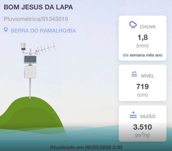 Segundo dados da estação fluviométrica do Serviço Geológico do Brasil (SGB/CPRM), instalada na ponte Gercino Coelho, em Bom Jesus da Lapa, o rio atingiu 2,93 metros na manhã deste sábado (22).