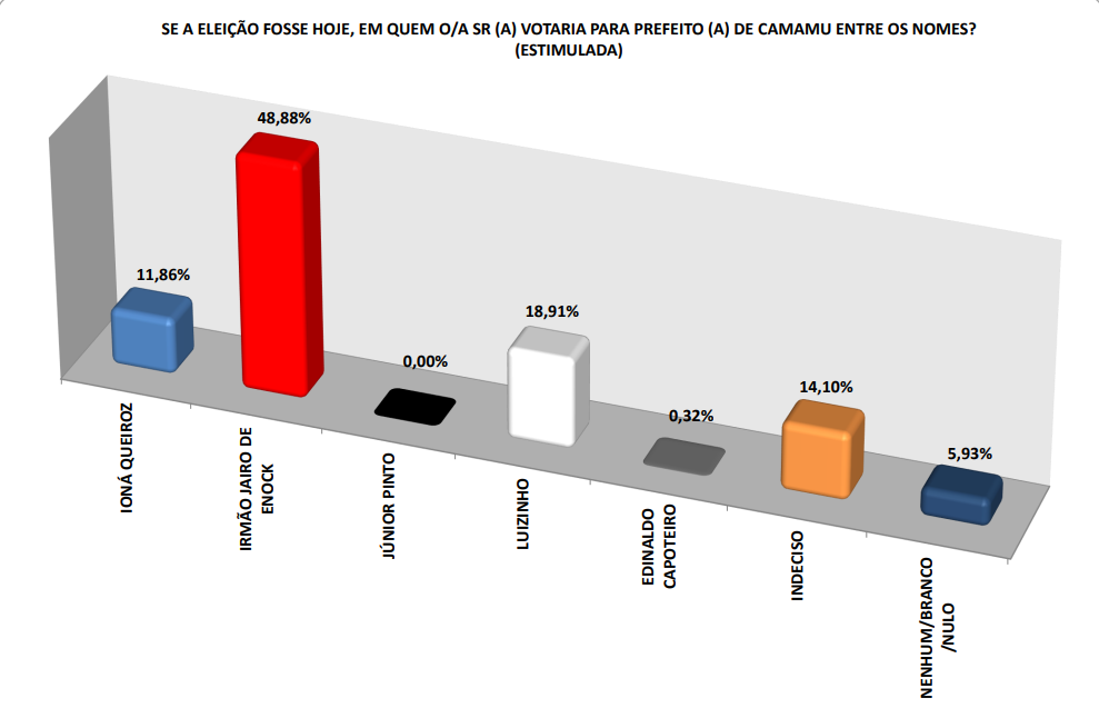 O prefeito atual de Camamu, Enoc Souza (PP), obteve uma aprovação significativa em sua gestão e posiciona seu sucessor, Irmão Jairo (Avante), como o favorito na eleição, com 48,88% das intenções de voto. É o que aponta o levantamento contratado pelo Bahia Notícias junto a empresa Séculus Análise e Pesquisa.