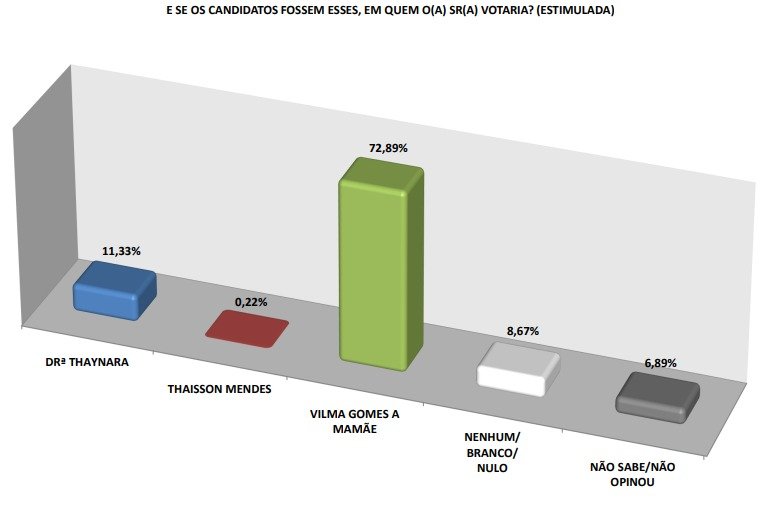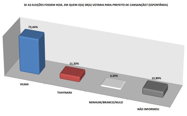 No cenário estimulado, quando são apresentados os nomes dos candidatos, Vilma Gomes surge com 72,89% das intenções de voto contra 11,33% de Dr.? Thaynara. O candidato do PSOL, Thaisson Mendes, apareceu com 0,22% das intenções de voto. 8,67% dos cansançãoenses responderam que não votariam em nenhum ou nulo e 6,89% não responderam.