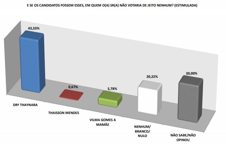 Com relação à rejeição, quando questionados em que eles não votariam de jeito nenhum, 43,33% dos entrevistados citaram a candidata Dr.? Thaynara e 5,78% responderam Vilma Gomes. Thaisson Mendes apareceu com 0,67% das respostas. 20,22% dos munícipes responderam “nenhum” ou nulo e 30% não souberam ou não opinaram.