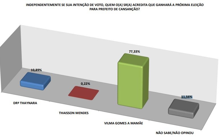 Quando perguntados sobre o candidato que deve ganhar a eleição, independente das intenções de voto, 77,33% responderam que a atual prefeita deve se reeleger. 10,89% citaram a vitória de Dr.? Thaynara e 0,22% Thaisson Mendes. 11,56% não responderam.