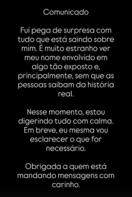 “Fui pega de surpresa com tudo que está saindo sobre mim. É muito estranho ver meu nome envolvido em algo tão exposto, e, principalmente, sem que as pessoas saibam da história real. Estou digerindo tudo com calma. Em breve, eu mesma vou esclarecer o que for necessário.”