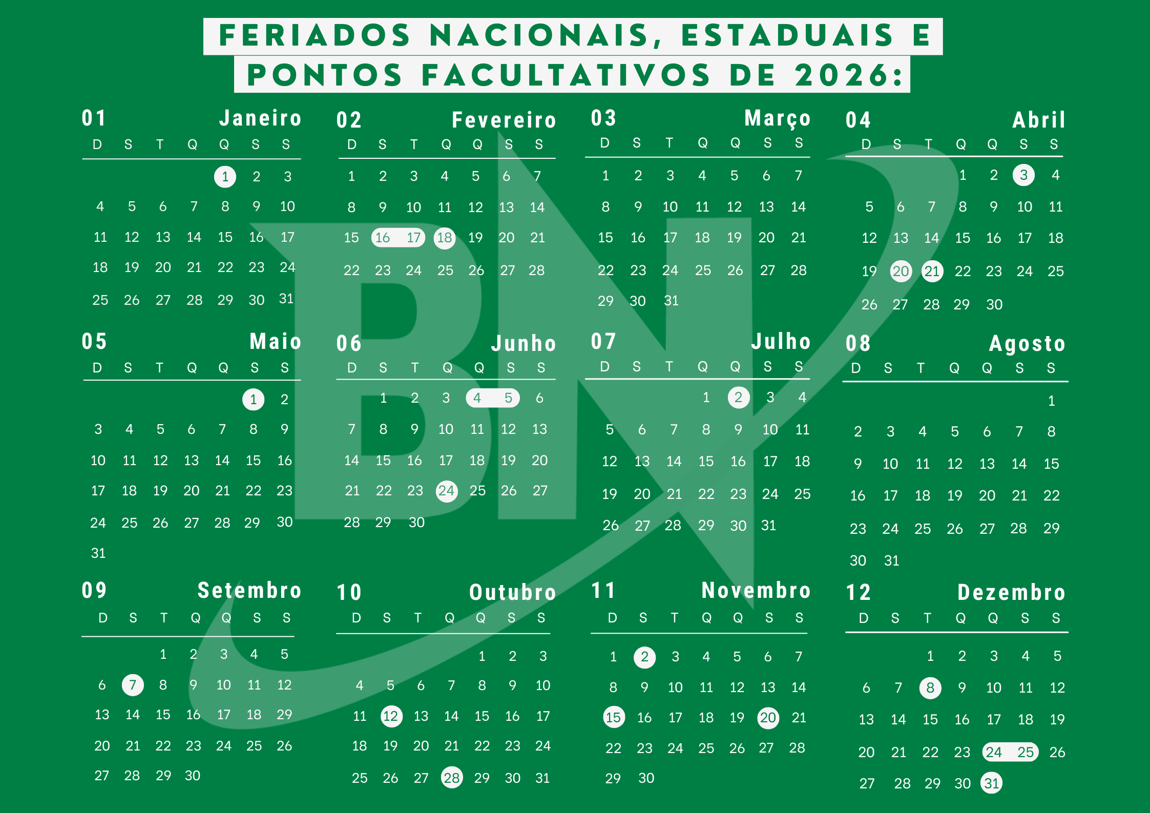 Feriados nacionais, estaduais e pontos facultativos de 2026: