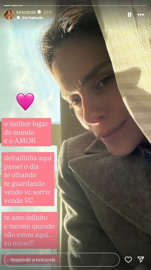 Em seu perfil, a atriz Carolina Dieckmann compartilhou uma foto deitada no quarto onde a amiga está internada. “O melhor lugar do mundo é o amor. Deitadinha aqui passei o dia te olhando, te guardando, vendo você sorrir, vendo você”, escreveu.