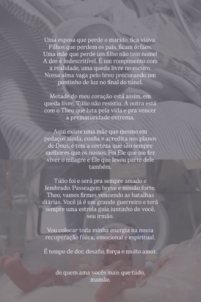 Segundo o casal, Théo, o segundo filho da nova gestação, está lutando para viver e segue internado. "Túlio foi e será pra sempre amado e lembrado. Passagem breve e missão forte. Theo, vamos firmes, vencendo as batalhas diárias. Você já é um grande guerreiro e terá sempre uma estrela guia juntinho de você, seu irmão".