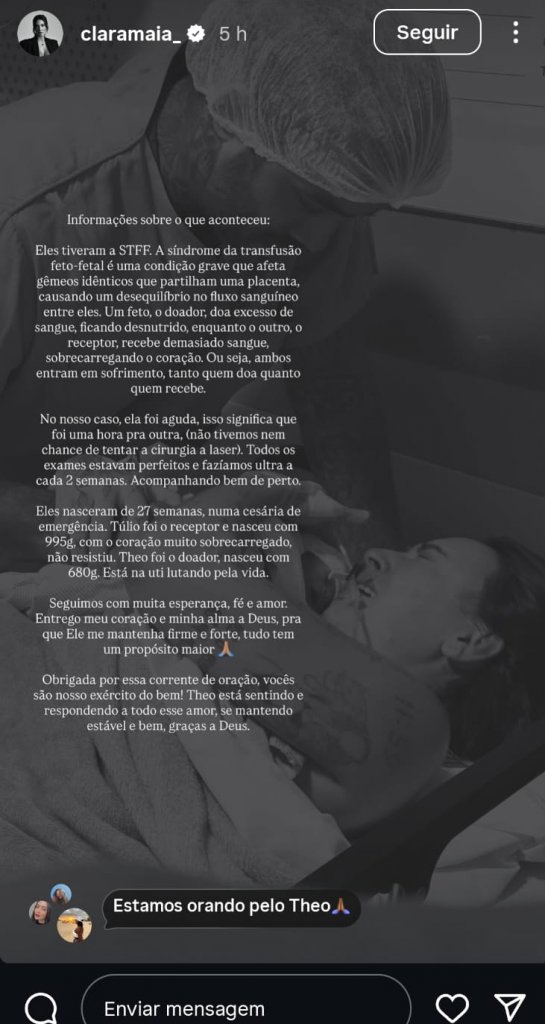 Atualmente, Theo, o gêmeo doador está na UTI. Os gêmeos nasceram de 27 semanas, em uma cesária de emergência. Túlio, o gêmeo receptor, não resistiu. “Obrigada por essa corrente de oração, vocês são nosso exército do bem! Theo está sentindo e respondendo a todo esse amor, se mantendo estável e bem, graças a Deus”, escreveu em uma das publicações.