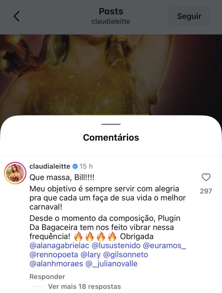 “Que massa, Bill!!!! Meu objetivo é sempre servir com alegria pra que cada um faça de sua vida o melhor carnaval! Desde o momento da composição, Plugin Da Bagaceira tem nos feito vibrar nessa frequência! Obrigada”, escreveu.