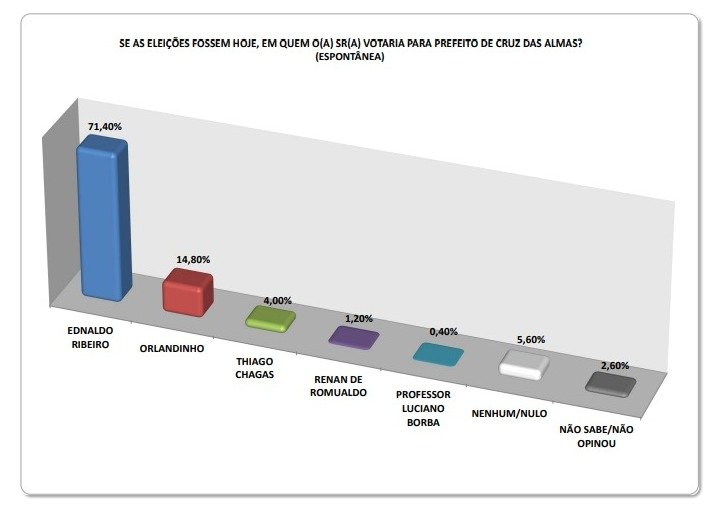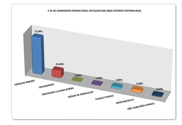 No cenário espontâneo desenvolvido pela equipe de pesquisa, Ednaldo Ribeiro aparece na liderança com 71,40%, contra 14,80% de Orlandinho. Enquanto, aqueles que votariam nulo somam 5,60% e os que não responderam 2,60%.