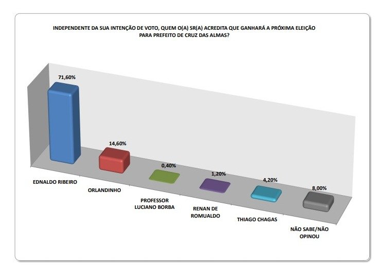 Ednaldo também lidera a pesquisa de quem as pessoas acreditam que vai ganhar independente de quem votarão, com 71,60%. Seguido por Orlandinho com 14,60%. 8,00% não sabe ou decidiu não opinar.