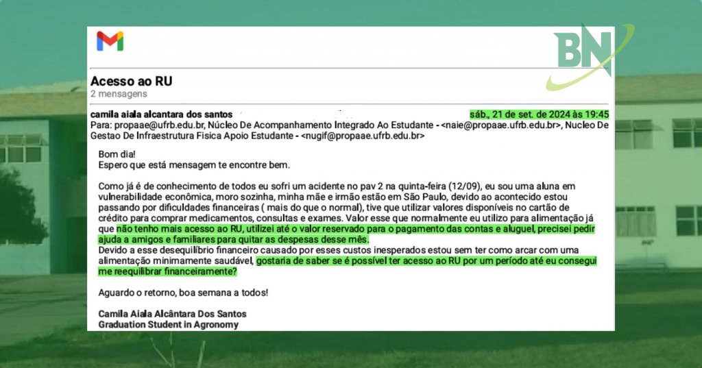 No final de setembro, Camila, uma estudante em vulnerabilidade social, enviou um e-mail solicitando acesso ao Restaurante Universitário (R.U) da UFRB. O R.U oferece alimentação para estudantes bolsistas, mas a solicitação de Camila não obteve resposta até o momento.