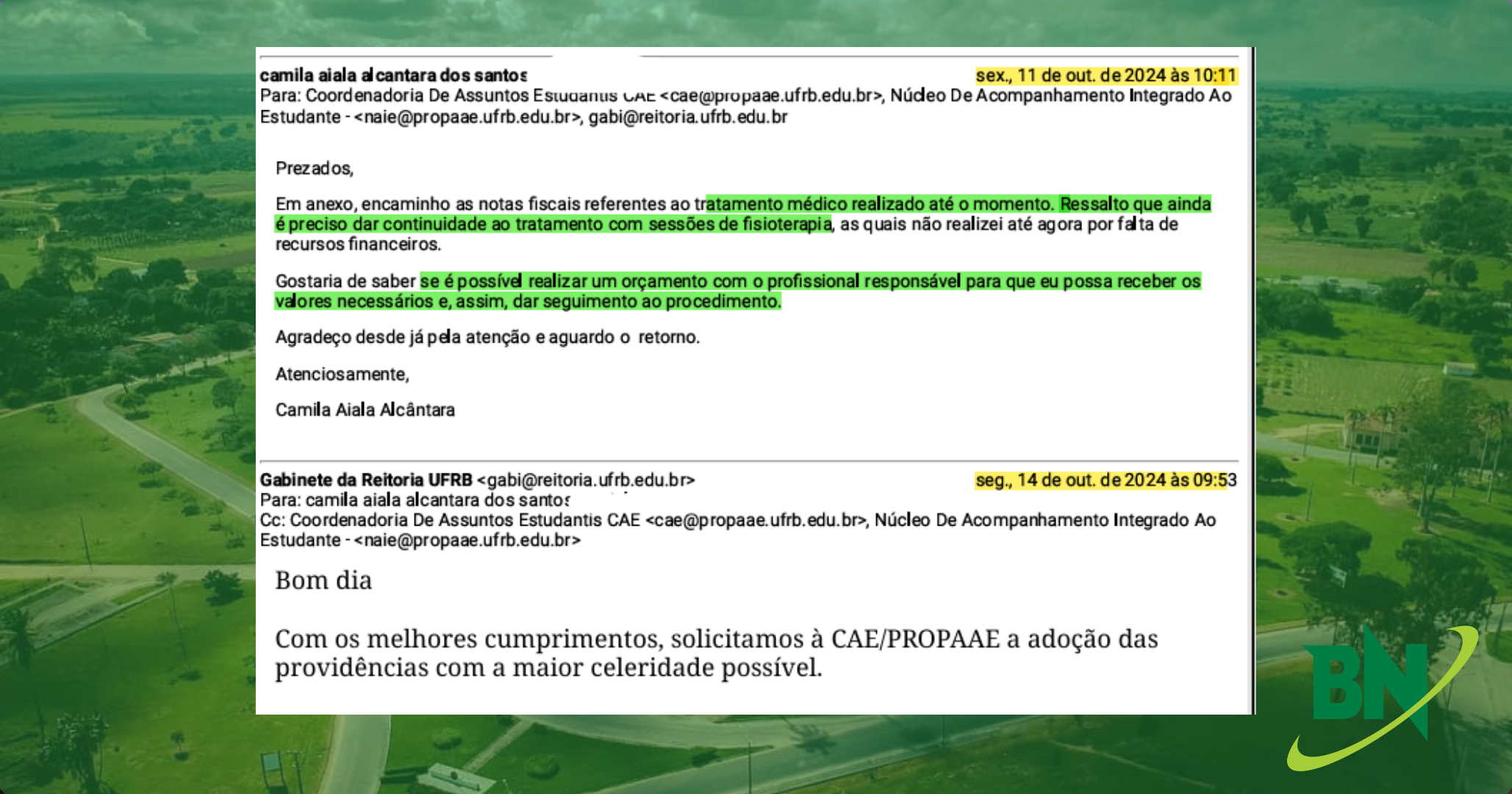 “Paguei por todo o procedimento. Paguei o ortopedista, paguei pelos exames e a resposta da universidade de início foi que eles não tinham protocolo para esse tipo de atendimento, que eles não sabiam muito bem o que fazer, como prosseguir, porque não tinha protocolo para isso, que era para eu aguardar. Depois de duas semanas enviando vários e-mails, a UFRB respondeu falando que eles me dariam um auxílio emergencial de 300 reais. Parcela Única”, detalha a estudante.