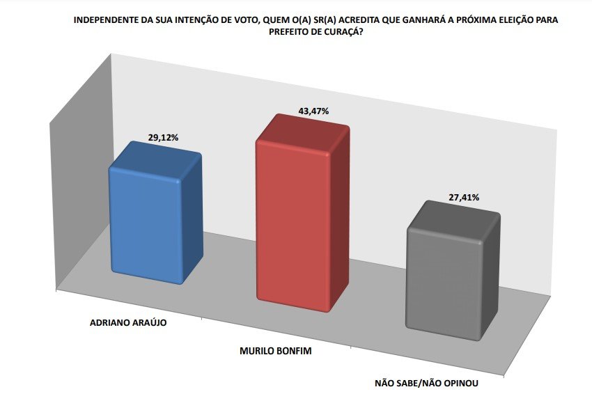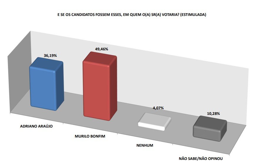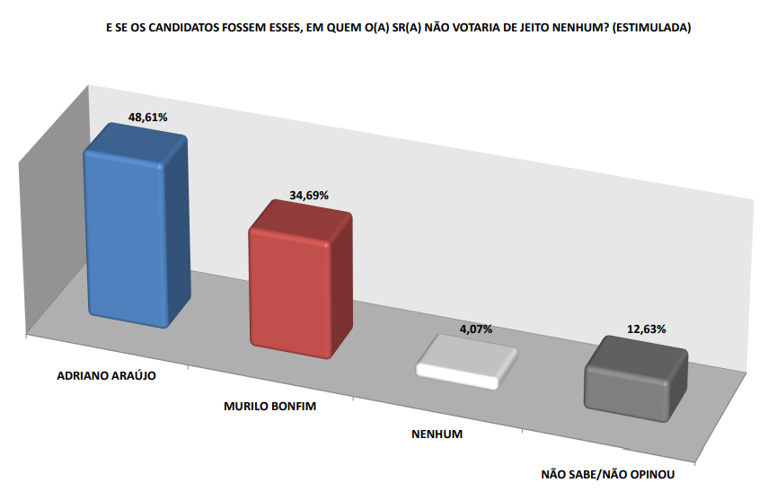 A pesquisa também procurou saber o grau de rejeição entre os postulantes. Neste quesito, Adriano Araújo tem 48,61% contra 34,69% de Murilo Bonfim, diferença de 13,92 pontos percentuais.