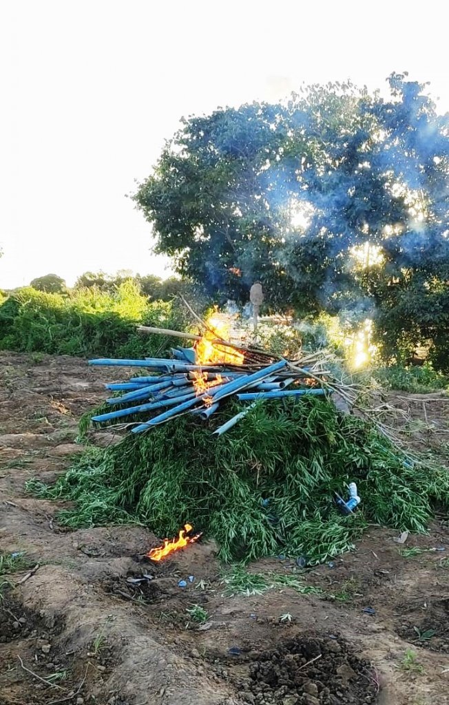 As plantas de maconha foram queimadas e as estruturas utilizadas para irrigação foram destruídas.