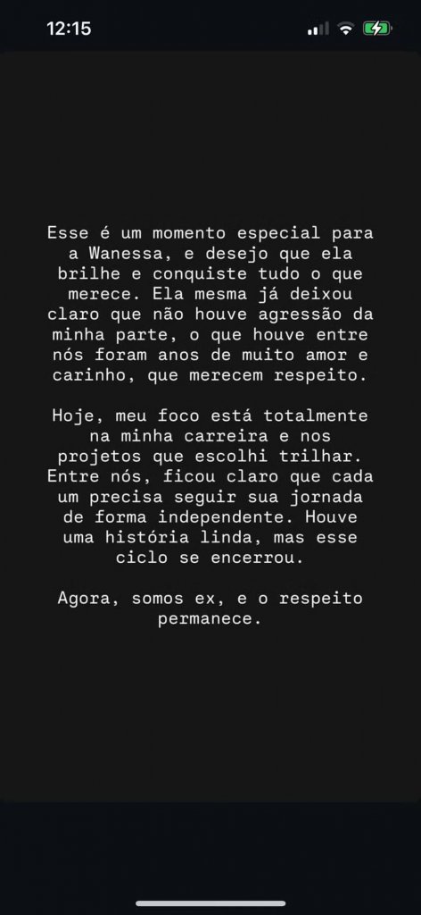 "Hoje, meu foco está totalmente na minha carreira e nos projetos que escolhi trilhar. Entre nós, ficou claro que cada um precisa seguir sua jornada de forma independente. Houve uma história linda, mas esse ciclo se encerrou", completou.