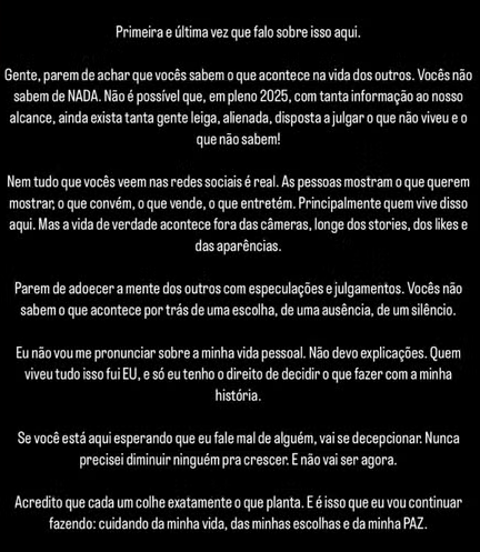 “Eu não fiz isso! Eu te amei de verdade! Eu te amei de verdade, tá? Saiba disso… Saiba disso… Encontre alguém que cuide de você, encontre alguém melhor que eu [...] eu torço pela sua vitória”, completou.