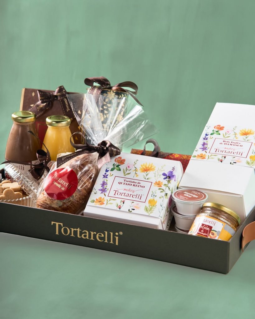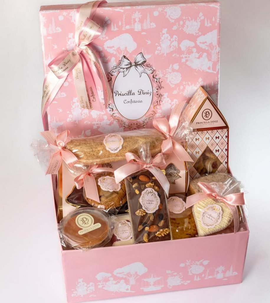 A marca apresenta cestas luxuosas e recheadas de doces finos. A Caixa Super Premium (a partir de R$ 499) reúne mini cake de pistache, Panipani de queijo, bem-casados, bolo gelado dark, quiche de queijo reino, pudim de Nutella, croissants, morangos do amor e uma casinha de biscoitos amanteigados. As opções mais compactas incluem a Caixa Premium (R$ 460), a Caixa Special (R$ 380) e a Cesta Mommy (R$ 282), todas com curadoria artesanal e visual delicado.