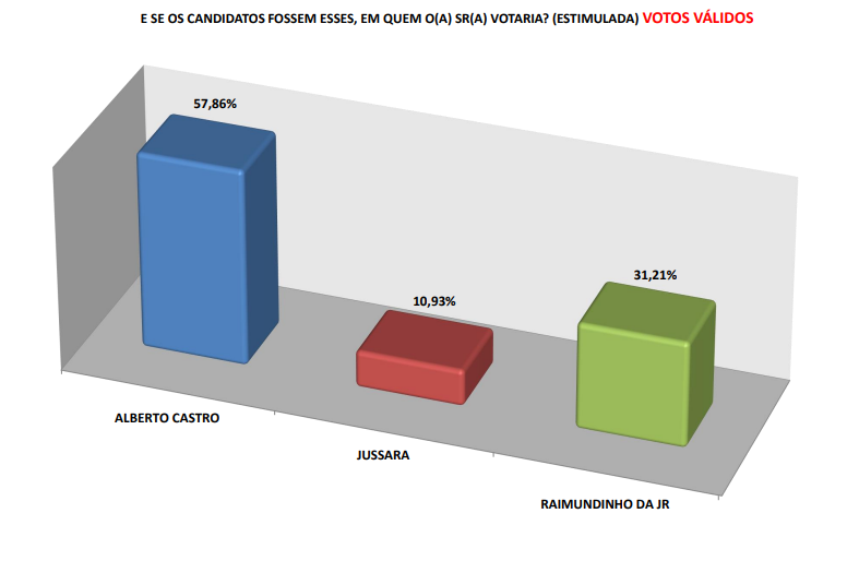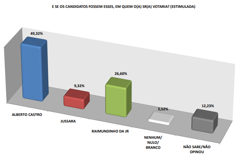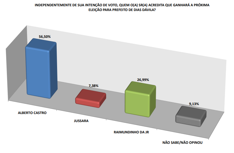 Quando perguntados sobre o candidato que deve ganhar a eleição, independente das intenções de voto, 56,50% responderam o nome de Alberto Castro e outros 26,99% responderam Raimundinho da JR. Outros 7,38% afirmaram acreditar na vitória de Jussara.