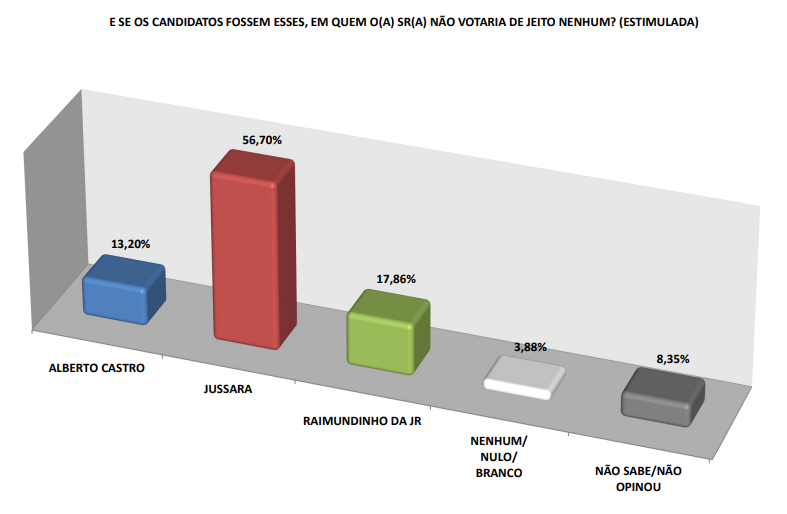 Em relação à rejeição, Jussara lidera a estatística com 56,70%. Atrás, Raimundinho da JR aparece com 17,86%, seguido de Castro (13,10%).