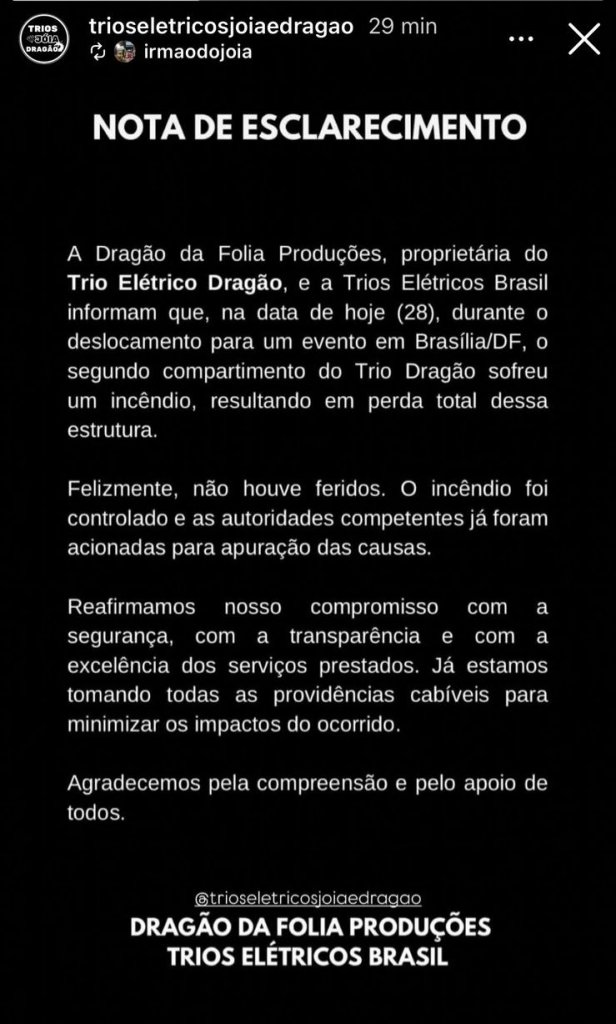 “A Dragão da Folia Produções, proprietária do Trio Elétrico Dragão, e a Trios Elétricos Brasil informam que, na data de hoje (28), durante o deslocamento para um evento em Brasilia/DF, o segundo compartimento do Trio Dragão sofreu um incêndio, resultando em perda total dessa estrutura. Felizmente, não houve feridos. O incêndio foi controlado e as autoridades competentes já foram acionadas para apuração das causas.”
