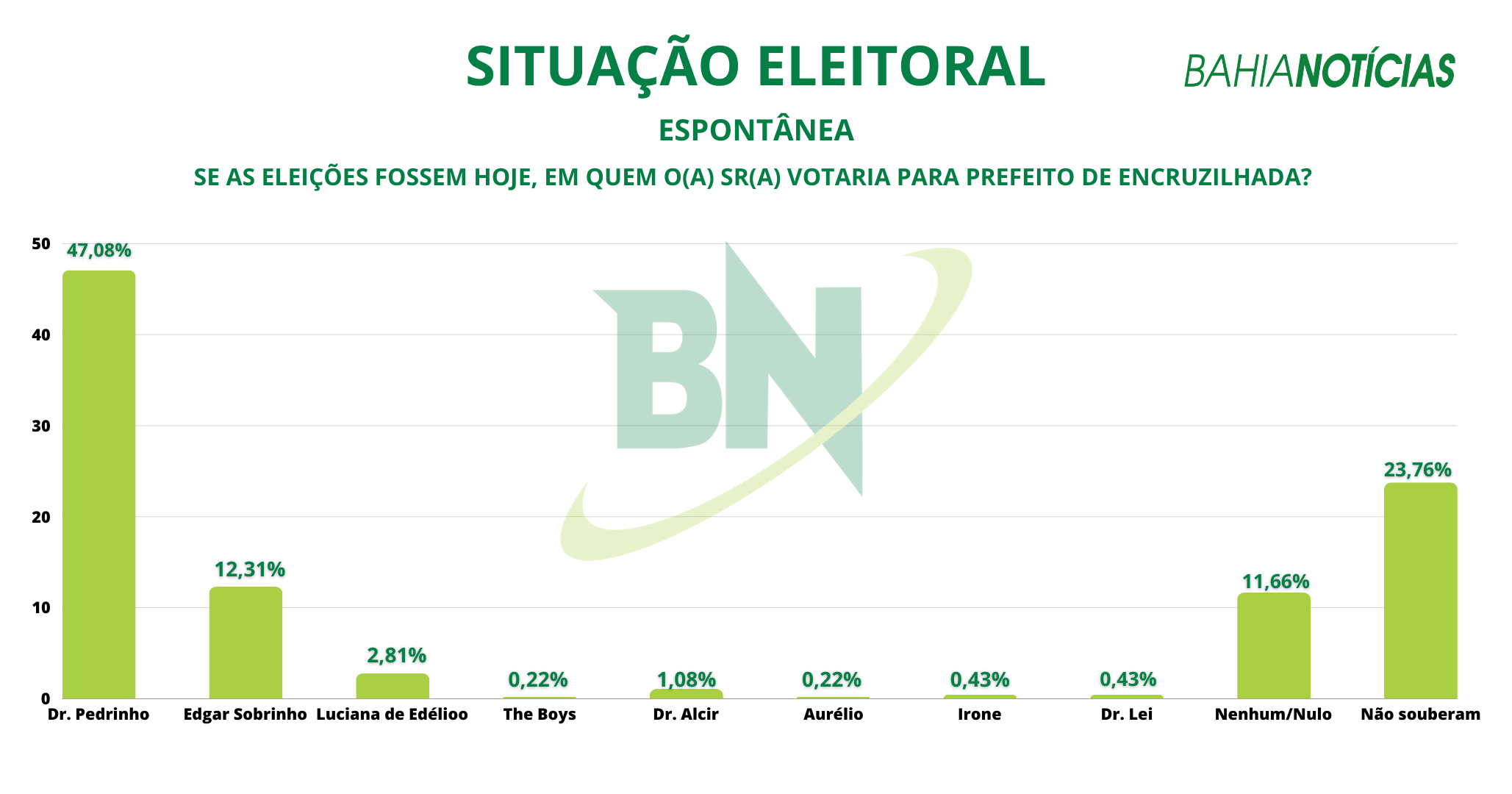 Em entrevista espontânea, quando não são apresentados os nomes dos candidatos, Dr. Pedrinho, aparece em 47,08% das respostas. O principal candidato da oposição, Edgar Sobrinho, aparece com 12,31%. Luciana de Edélio com 2,81% e Dr. Alcir com 1,08%. Os candidatos Dr. Lei e Irone aparecem igualmente com 0,43%. Aurélio e The Boys surgem com 0,22%. Outros 11,66% dos eleitores responderam “nenhum” e 23,76% não souberam ou não opinaram.