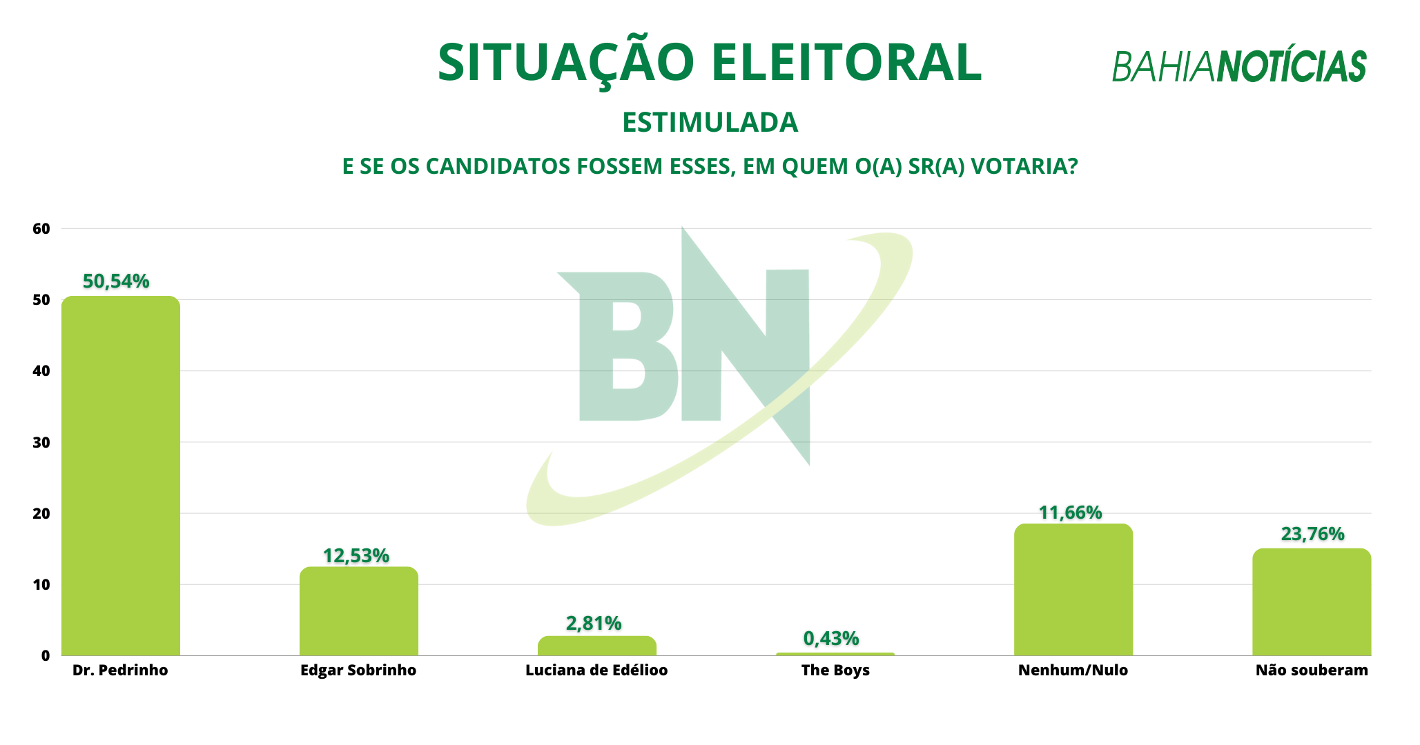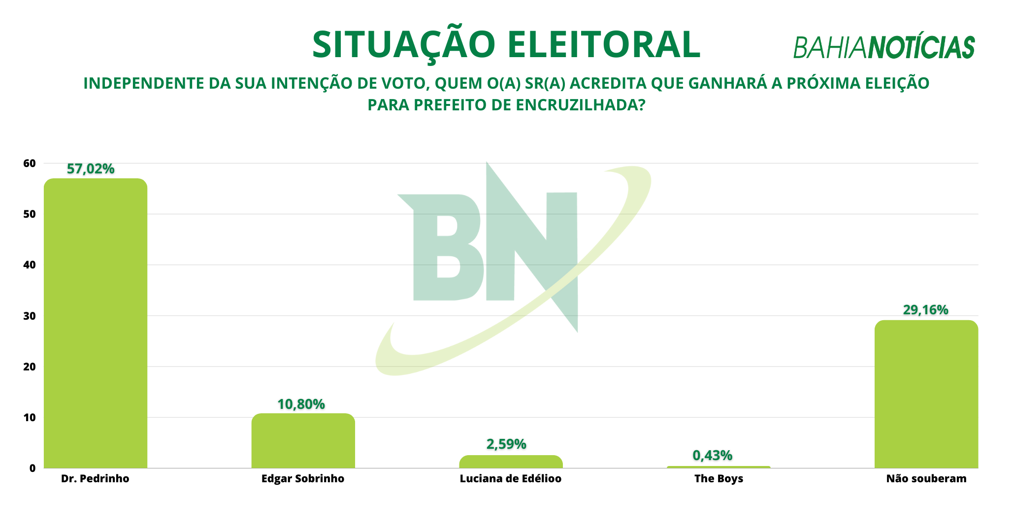 A pesquisa ouviu 463 eleitores entre os dias 26 e 27 de junho de 2024 e tem margem de erro de 4,5% para mais ou para menos e 95% de intervalo de confiança. O levantamento está registrado no Tribunal Superior Eleitoral (TSE) sob n.° BA-09800/2024.