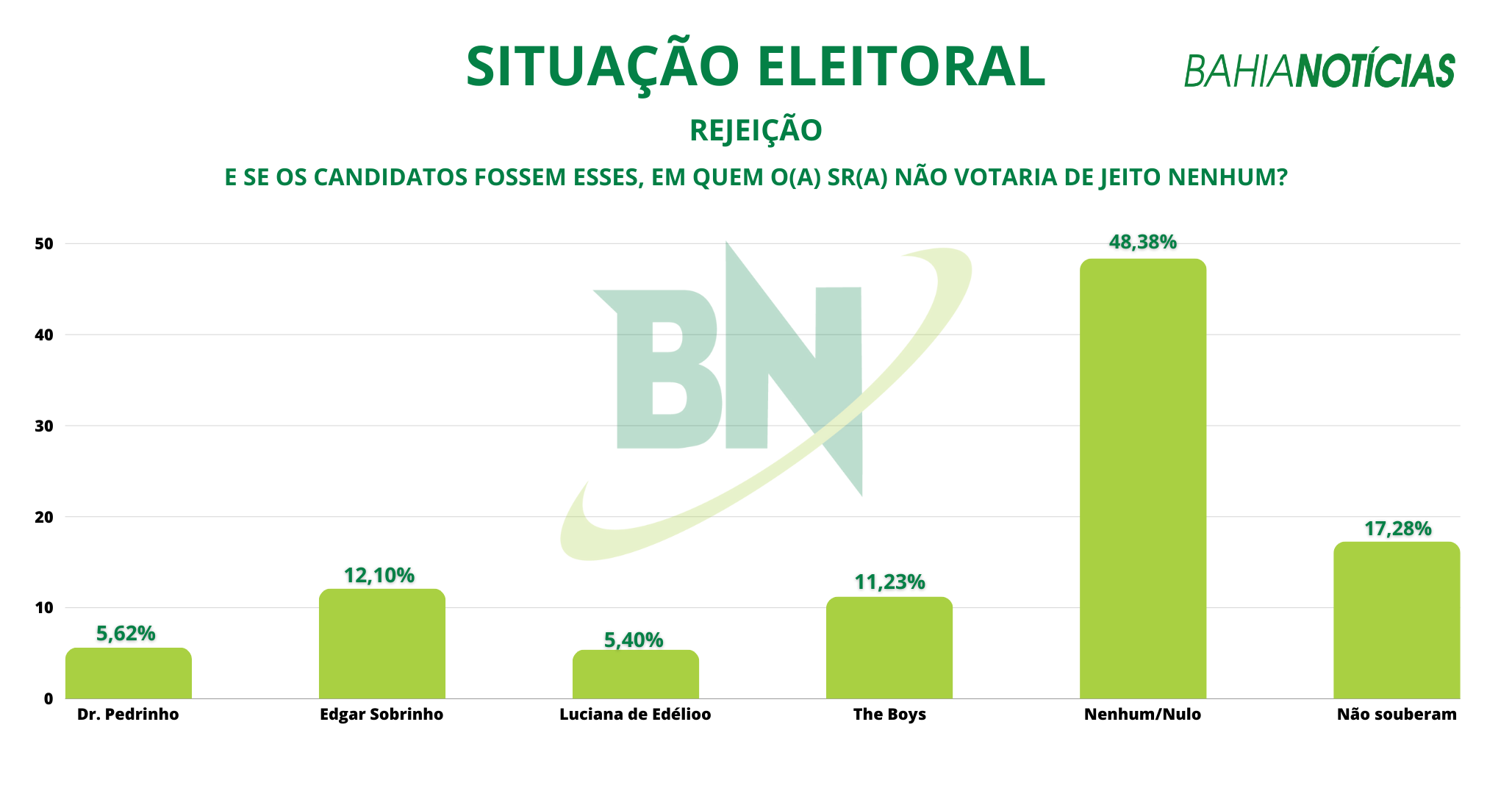 Com relação aos índices de rejeição, quando perguntados sobre “quem eles não votariam de jeito nenhum”, 48,38% dos entrevistados responderam “nenhum” e 17,28% não souberam responder. The Boys aparece com 11,23% e Edgar Sobrinho com 12,10%. Dr. Pedrinho com 5,62% e Luciana de Edélio com 5,40%.