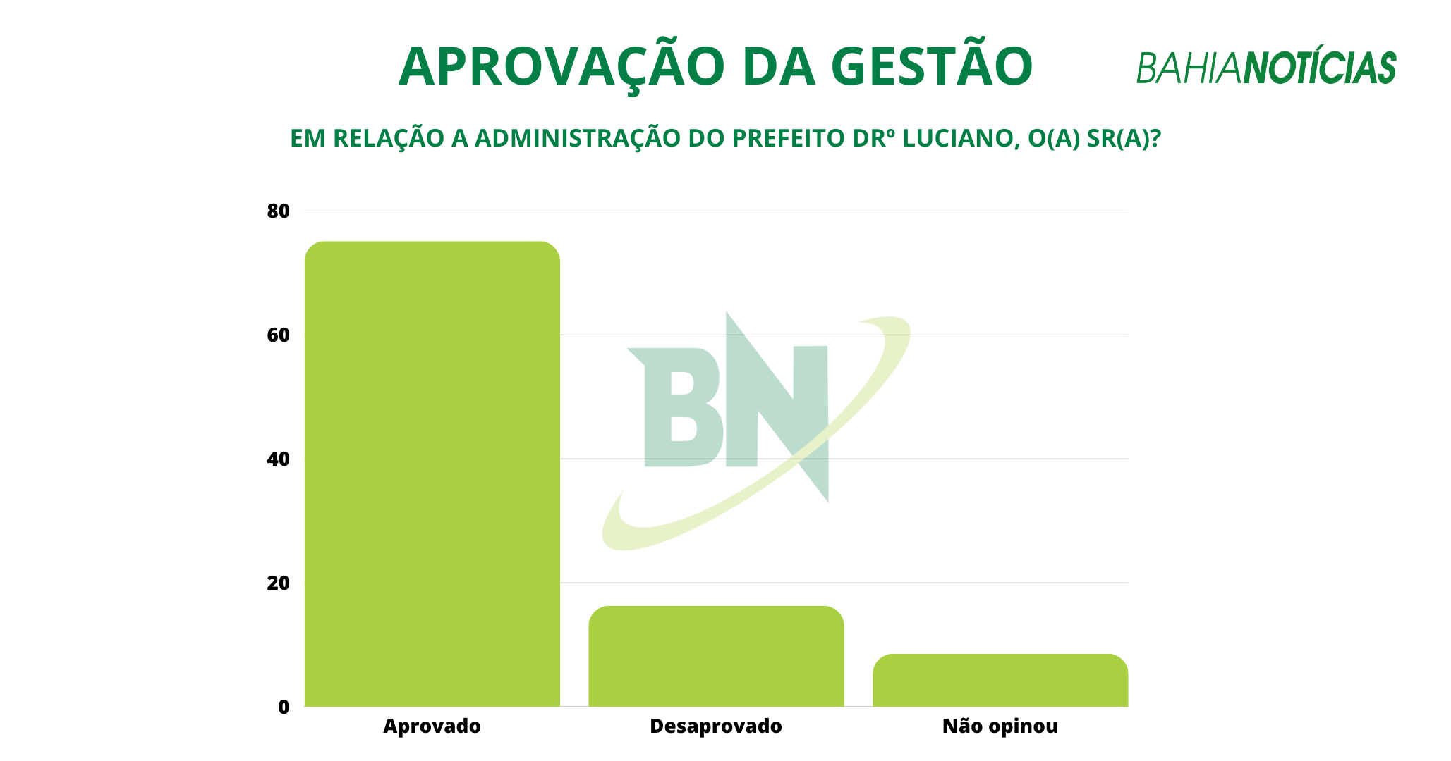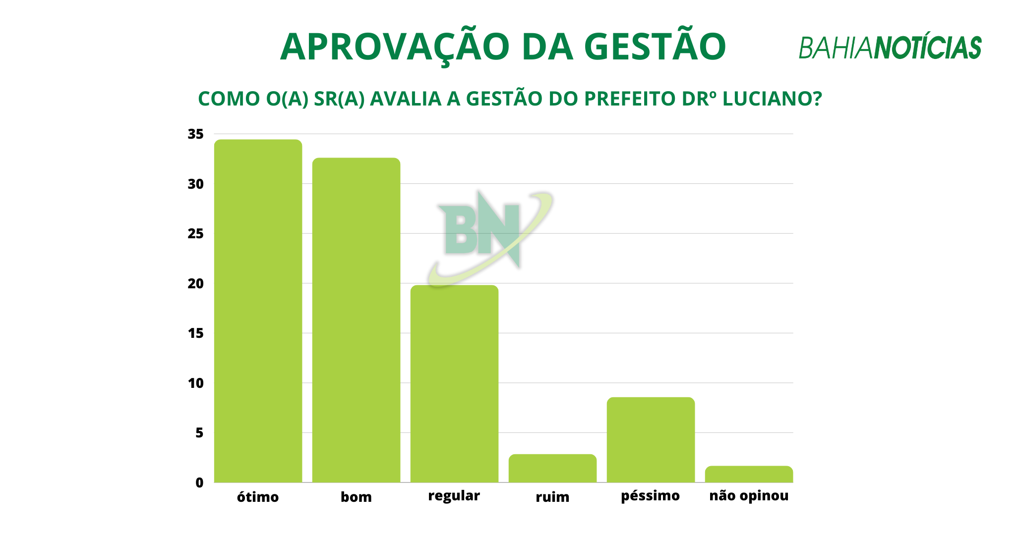 Entre os entrevistados, 16,30% dos eleitores desaprovou a gestão e 8,57% não opinaram. No que diz respeito a avaliação da gestão, 34,45% a avaliam como ótima; 32,61%, como boa; 19,83% como regular; 2,86% e 8,57%, responderam ruim ou péssimo, respectivamente. Outros 1,68% não opinaram.