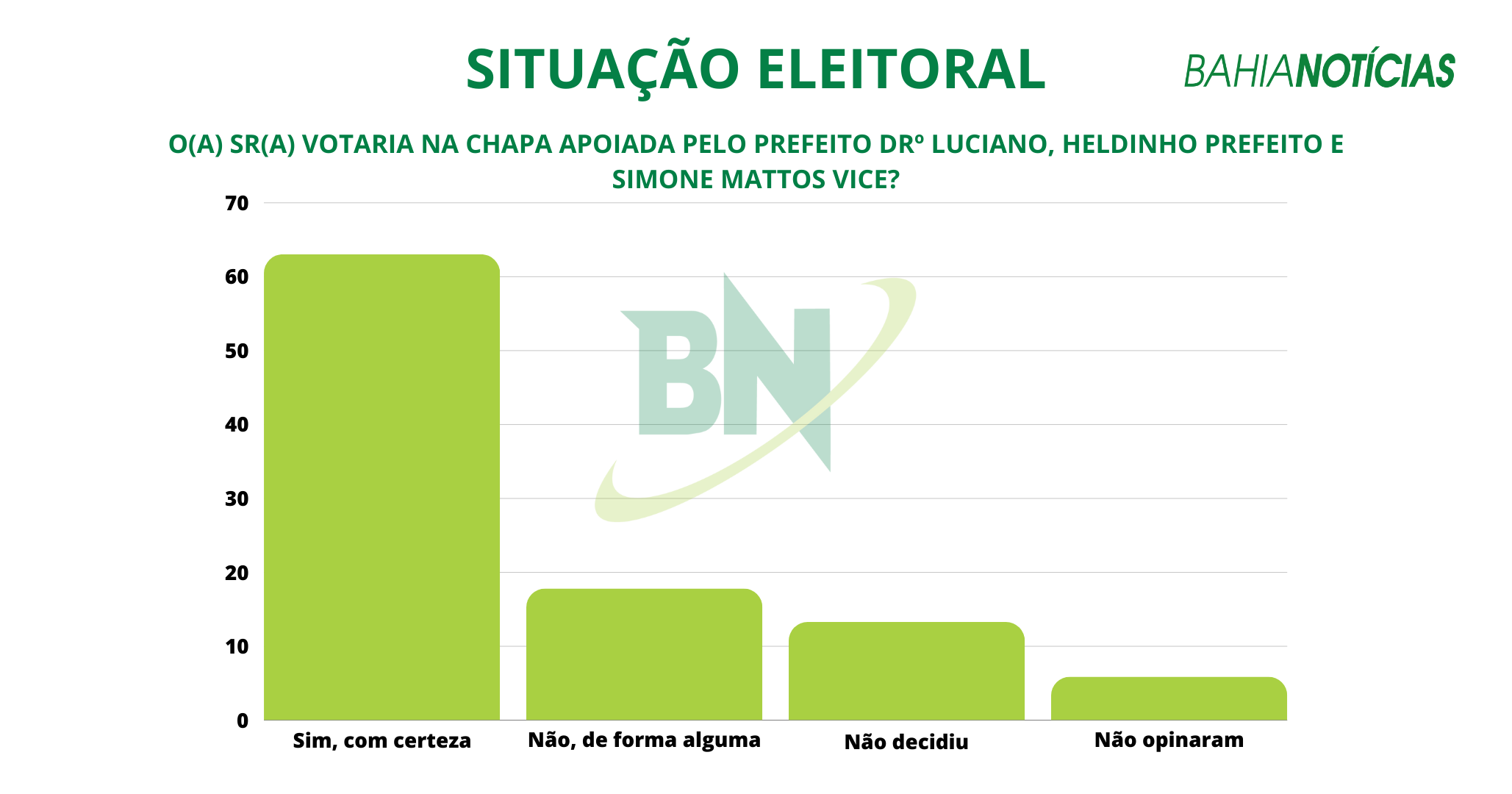 Quando perguntados sobre a corrida eleitoral, 63,03% dos entrevistados afirmaram que votariam “sim, com certeza” na chapa apoiada por Dr. Luciano, composta por Heldinho e Simone Mattos; 17,82% não votariam de forma alguma; 13,28% não decidiram; e outros 5,88% não opinaram.