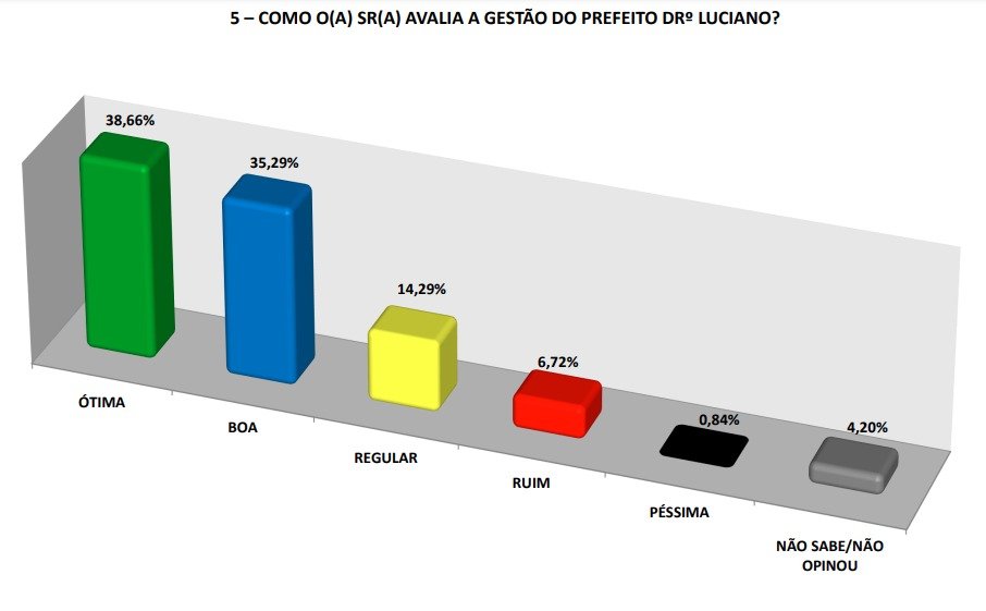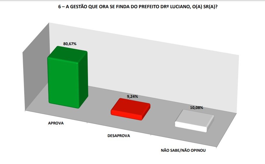 A pesquisa, que ouviu 595 munícipes nos dias 22 e 23 de dezembro, aponta que 9,24% desaprovam o último mandato de Dr. Luciano, entre 2021 e 2024. 10,08% não souberam responder ou não opinaram. O levantamento utilizou entrevistas presenciais e possui um intervalo de confiança de 95% e margem de erro de até 4%.