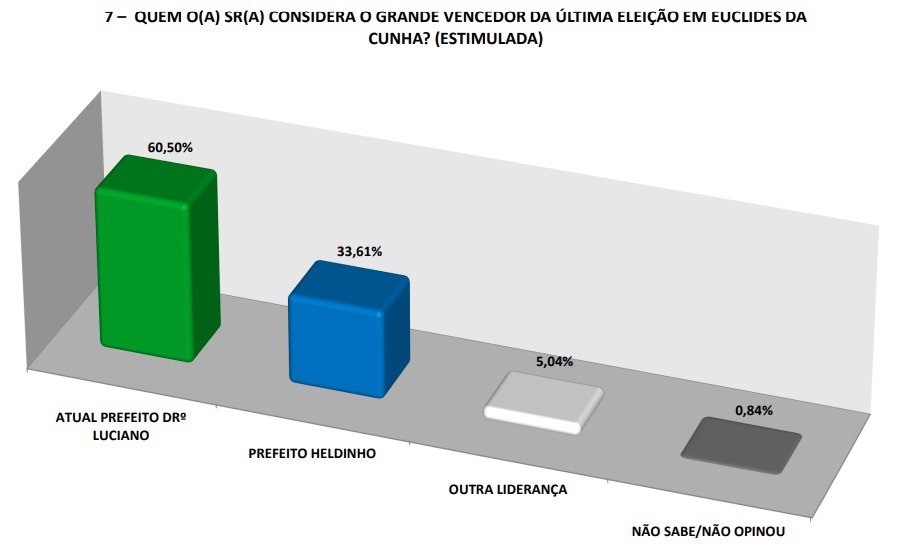 Em cenário estimulado, quando são apresentados os nomes dos atores políticos, 60,50% dos euclidenses apontaram o Dr. Luciano como o principal vencedor das eleições municipais, a frente do sucessor eleito, Heldinho Macedo, com 33,61%. 5,04% responderam “outra liderança” e 0,84% não souberam ou não opinaram.