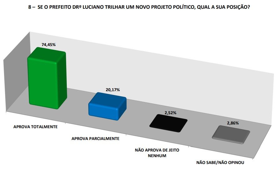 No que diz respeito a futuros planos na política, 74,45% dos euclidenses aprovam totalmente a indicação de Dr. Luciano de seguir um novo projeto político. 20,17% aprovam parcialmente e 2,52% não aprovam de jeito nenhum. 2,86% não opinaram.