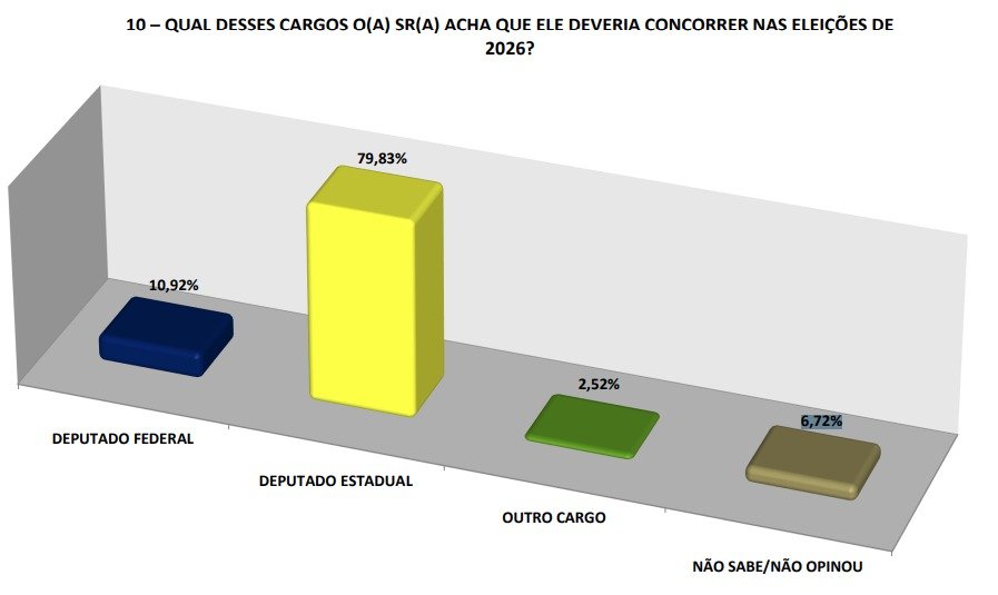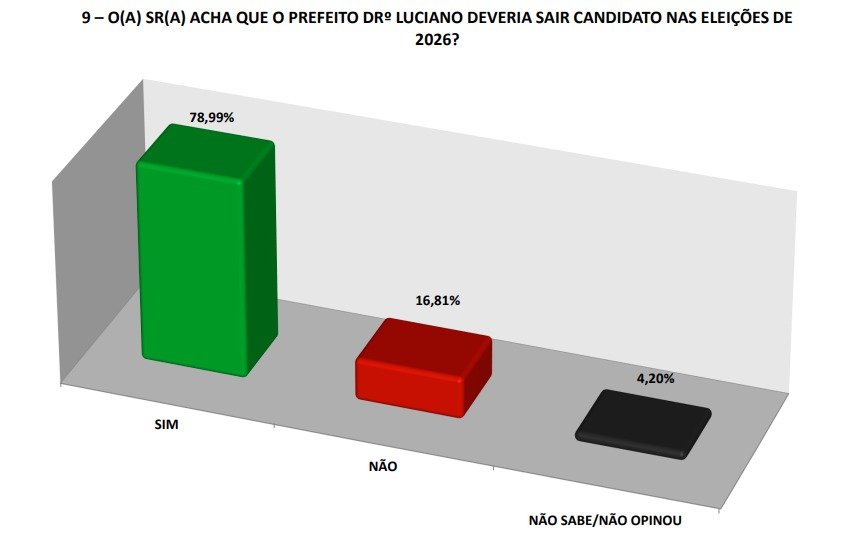 Ainda com relação às eleições de 2026, 79,83% dos euclidenses apontam que Dr. Luciano deveria se candidatar a deputado estadual; 10,92% responderam “deputado federal”; 2,52% disseram “outro cargo e 6,72% não souberam ou não opinaram.