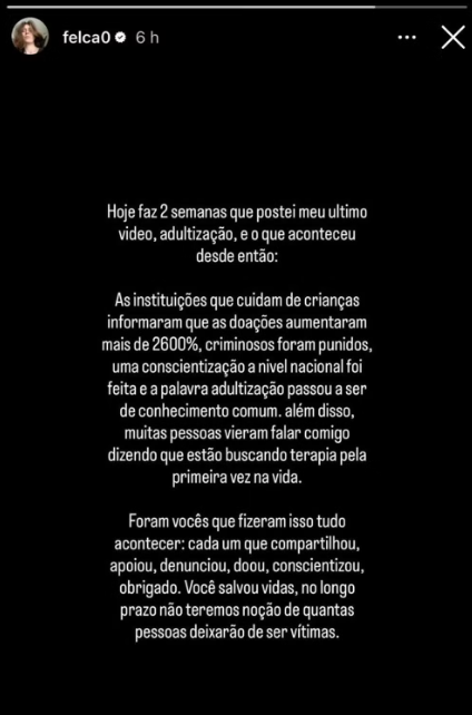 "Hoje faz duas semanas que postei meu último vídeo, adultização, e o que aconteceu desde então: as instituições que cuidam de crianças informaram que as doações aumentaram mais de 2600%, criminosos foram punidos, uma conscientização a nível nacional foi feita e a palavra adultização passou a ser de conhecimento comum. Além disso, muitas pessoas vieram falar comigo dizendo que estão buscando terapia pela primeira vez na vida", disse.