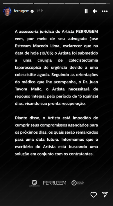 "O artista foi submetido a uma cirurgia de colecistectomia laparoscópica de urgência devido a uma colecistite aguda. Seguindo as orientações do médico que lhe acompanha, o Artista necessitará de repouso integral pelo período de 15 (quinze) dias, visando sua pronta recuperação. Diante disso, o artista está impedido de cumprir seus compromissos agendados para os próximos dias, os quais serão remarcados para uma data futura. Informamos que o escritório do artista está buscando uma solução em conjunto com os contratantes", diz o comunicado.